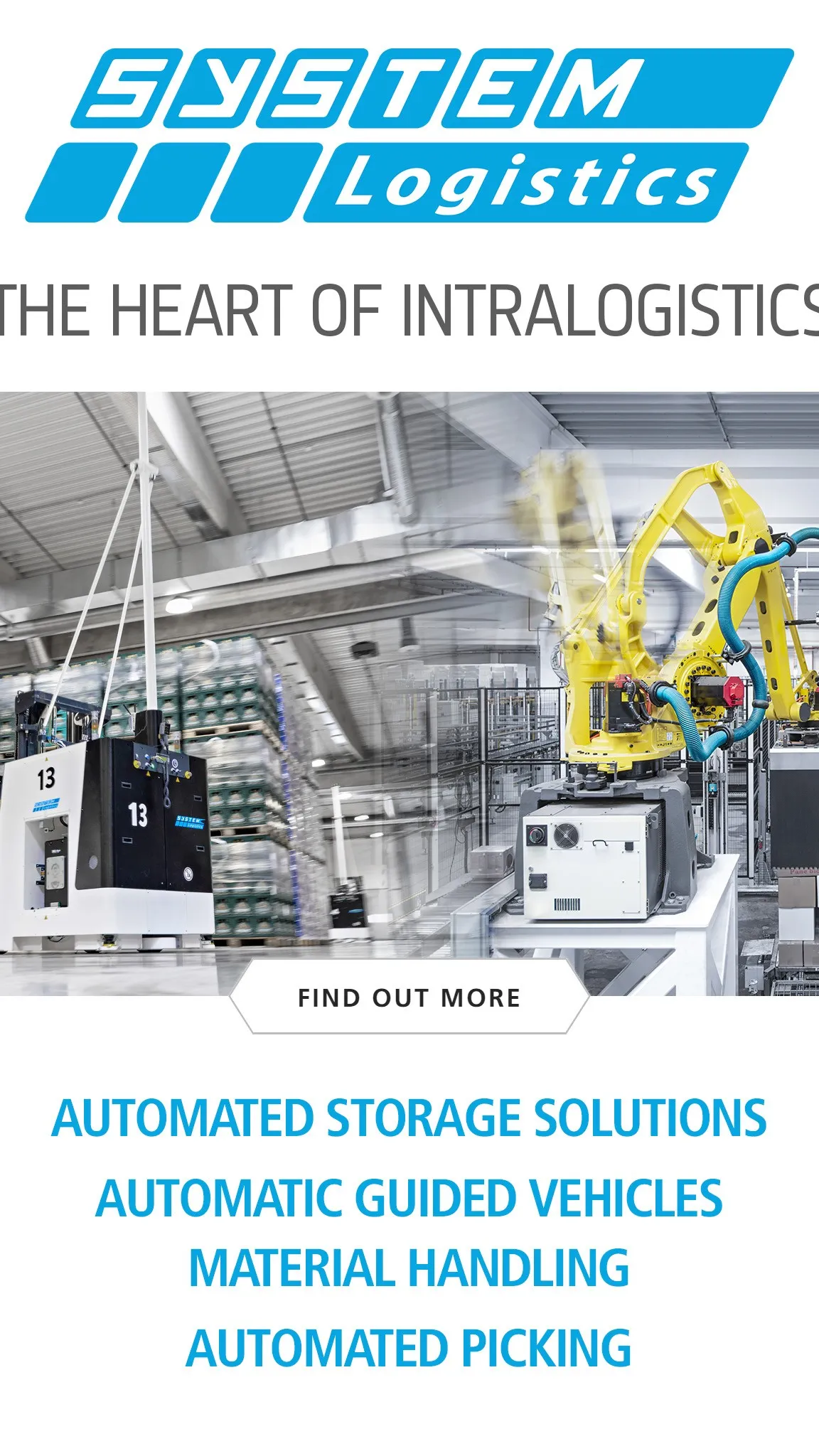 System Logistics provides innovative intralogistics and material handling solutions for the optimization of warehouse supply chains, distribution centres and production centres all over the world. Specializing in the Food & Beverage industry, System Logistics develops tailor-made solutions for storage and automated picking, including stacker cranes, high-rotation warehouses, high-speed shuttles, AGV (Automated Guided Vehicles), software and services.